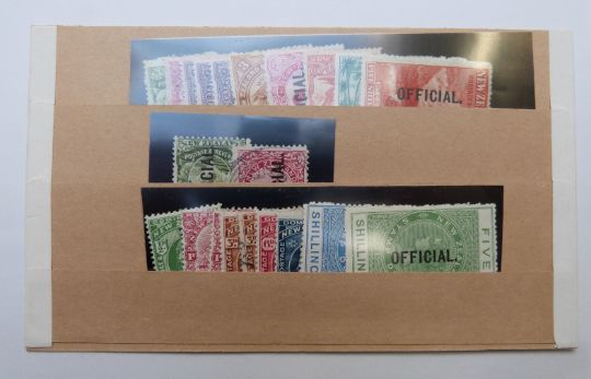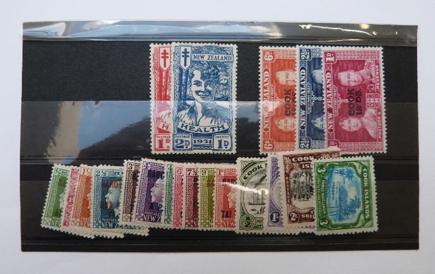 New Zealand mint stamps. 1931 Health stamps 1d and 2d. 1907-16 official overprints 1/2d-5s. 1913-25 Fiscal overprints 2s and 5s. Cook Islands mint stamps 1938 1s-3s. Rarotonga mint stamps 1919 overprints 1/2d-1s.