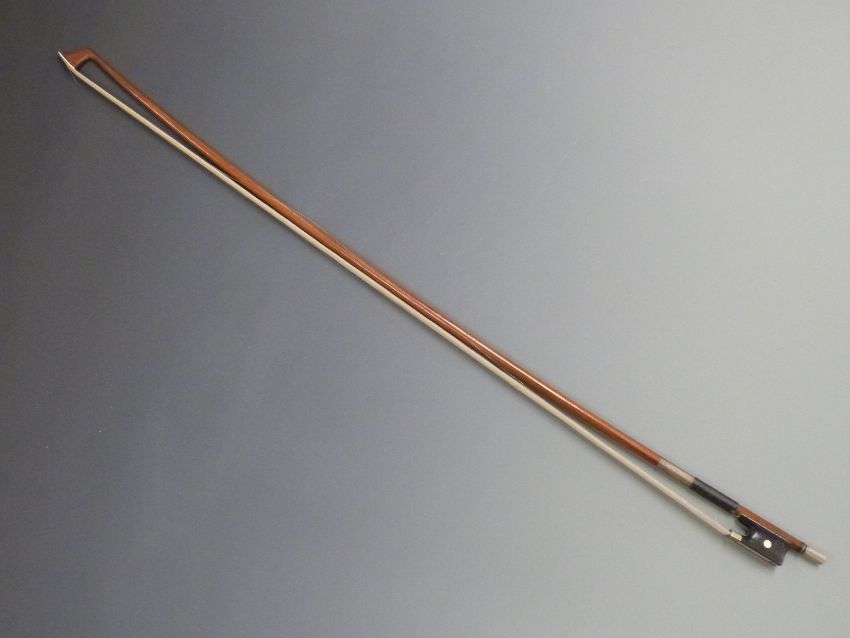 Violin bow by H R Pfretzschner, round stick, mother of pearl eye to frog, impressed with coat of arms, nickel button with ebony inset, 54g