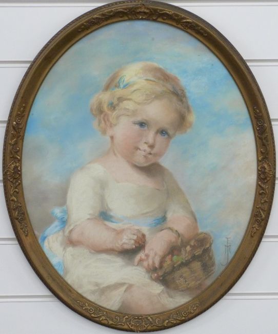 Chalk / pastel drawing of child with basket, monogram EMJ to bottom right, likely early 20thC, 50 x 39cm, framed and glazed
