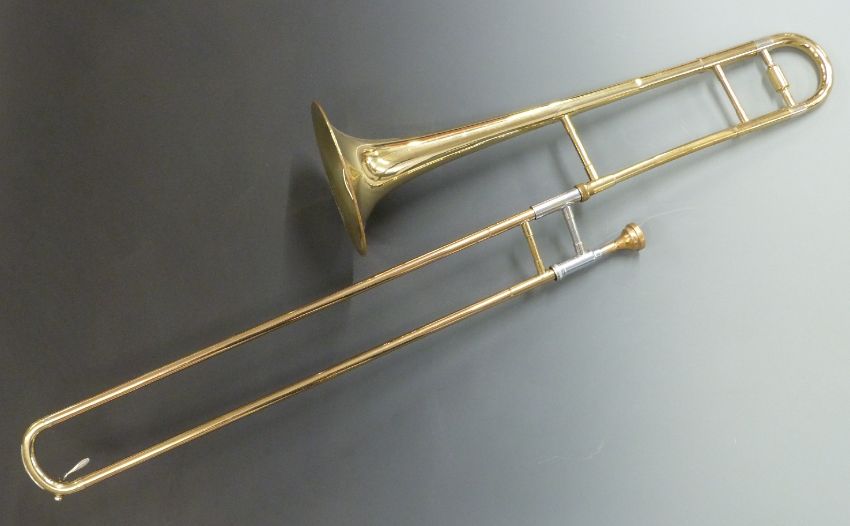 Blessing Scholastic Elkhart USA brass and plated trombone, serial no 257719 with Denis Wick London mouthpiece, in hard fitted carry case