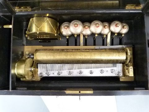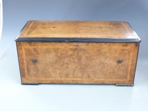 19thC bells and drum in view 8 air musical box, with burr walnut and inlaid case, with tune sheet also giving serial number 22653 also marked 879, the movement having seven bells and drum with levers to disengage if desired, length of cylinder 33cm, overall length 58cm, with information sheet suggesting it to be by Ami-Rivene