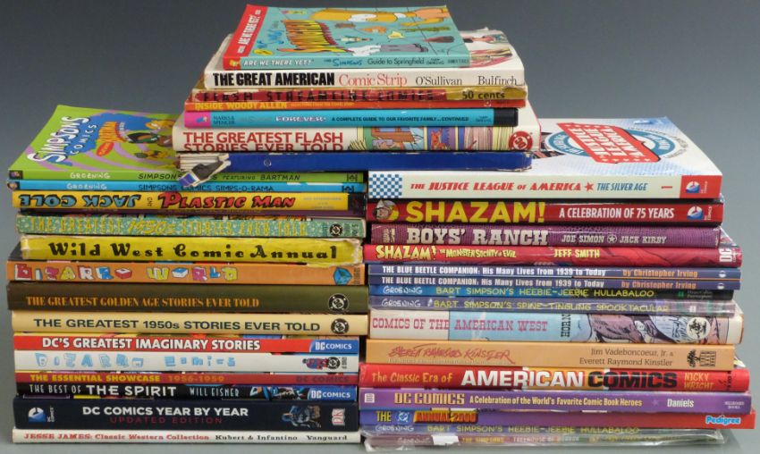 Thirty-eight DC and similar comic books including Shazam!, The DC Annual, Jack Cole and Plastic Man, The Justice League of America, DC Comics By Year, The Best of The Spirit, American Comics, Boys's Ranch, Comics of the American West, Jesse James, Wild West Comic Annual etc.