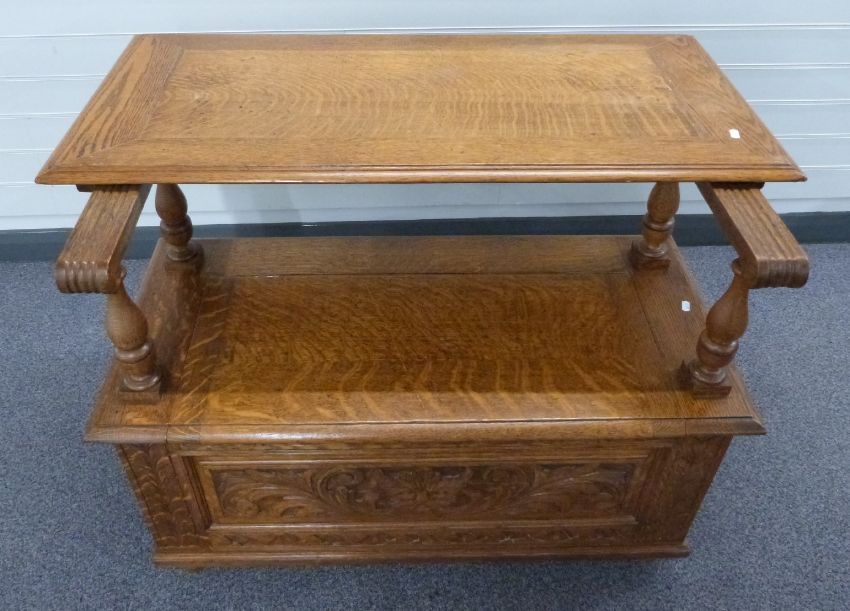 Early 20thC carved oak monk's bench, W107 x D58 x H104cm