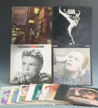 David Bowie - Eleven albums including Bowie And The Spiders From Mars Last Stand His Masters Voice (TAKRL1935) and The 1980 Floor Show (TAKRL1905) both appear VG/VG with plain white labels. Also Space Oddity, The Man Who Sold The World, Hunky Dory, Ziggy etc