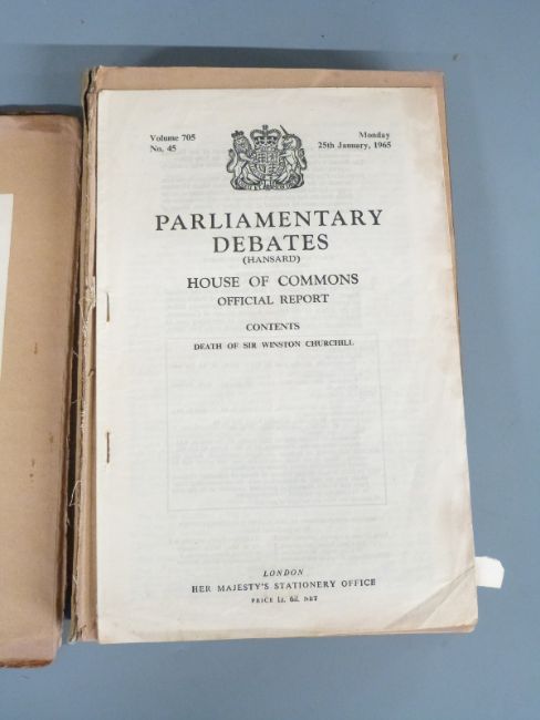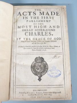 The Acts Made in the First Parliament of our Most High and Dread Soveraigne Charles by The Grace of God, printed for Robert Young 1633 and containing Acts for Second 1641, Third 1644, Second, Third, Fourth and Fifth 1646, Sixth 1647, with Acts of the Second Triennial 1648, engraved titles and decorated initials ex Foreign Office library copy with bookplate and ink stamp on covers (binding worn) with printed Parliamentary Debate dated 1965 on Death of Sir Winston Churchill loosely inserted