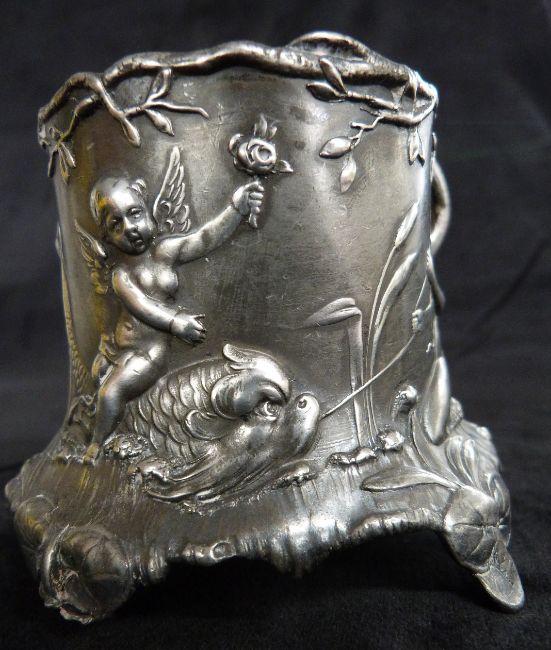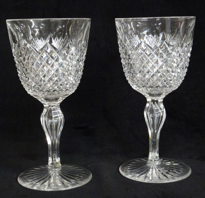 A pair of hobnail cut wine glasses, WMF glass holder decorated with cherubs, covered cut glass salts, obelisk, painted milk glass vase etc
