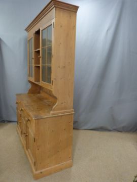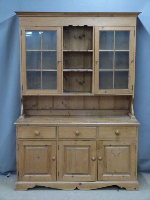 Pine dresser, the top having central shelves flanked by glazed display cupboards, the base fitted three drawers and three cupboards, W137 x D50 x H200cm