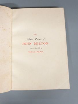 The Shorter Poems of John Milton with Twelve Illustrations by Samuel Palmer, published Seeley & Company, 1889 First Edition containing full-page plates with tissue guards bound in contemporary full vellum binding with gilt title and decorations on spine ruled gilt borders on both covers & gilt along top edge of pages
