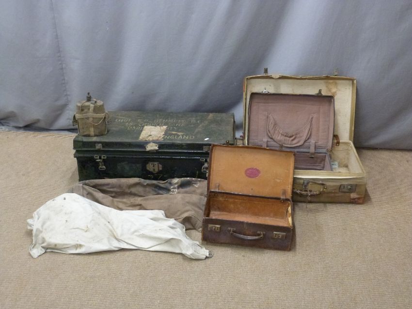 A twin handled military metal trunk and three vintage leather suitcases, one khaki covered, kit bags, water bottle etc, the trunk W83 x D45 x H28cm