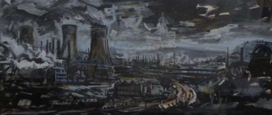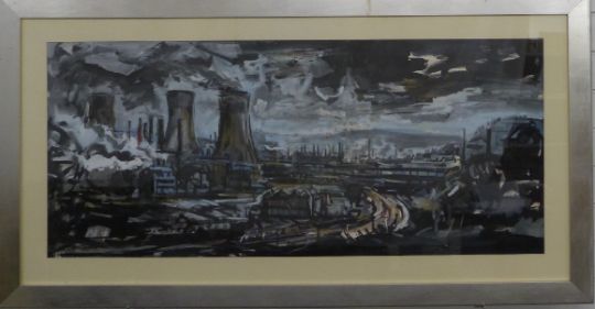 David Smith (1920-1998) watercolour/mixed media of Rotherham Steelworks, dated 1969, 54 x 124cm, framed and glazed