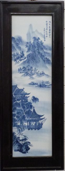 Chinese porcelain plaque decorated with a landscape scene and with calligraphy top right, 72 x 21cm