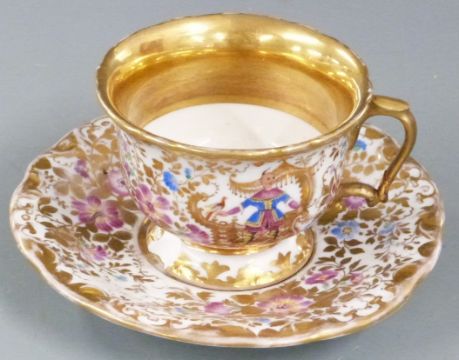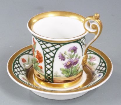 Three 19thC cabinet cups and saucers including a German/Austrian example hand decorated with flowers amongst latticework, tallest 13cm