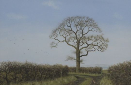 Simon Turvey (b1957) watercolour winter scene with oak tree, track, birds and pheasant, 19 x 21cm, framed and glazed
