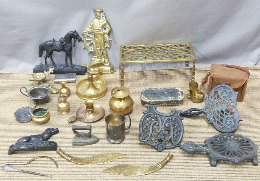 A collection of 19th / 20thC metalware including hunting dogs, horses, trench art etc
