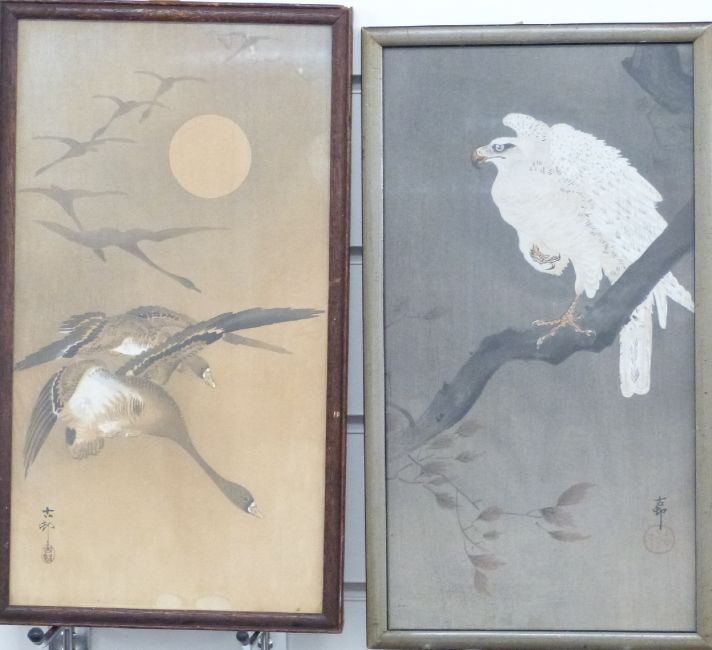 Two 19thC Japanese watercolours, one of geese the other an eagle, both 20 x 36cm