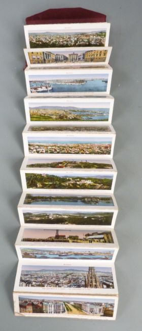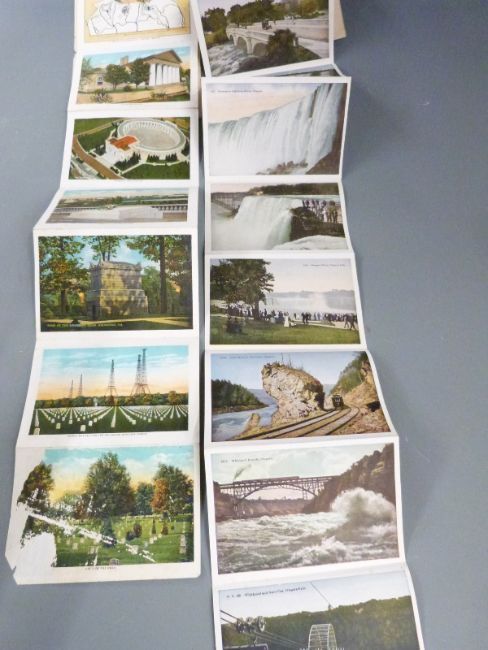 A collection of souvenir postcards and photographs including Barcelona, Montreal, Maine, Niagra Falls, Arlington etc