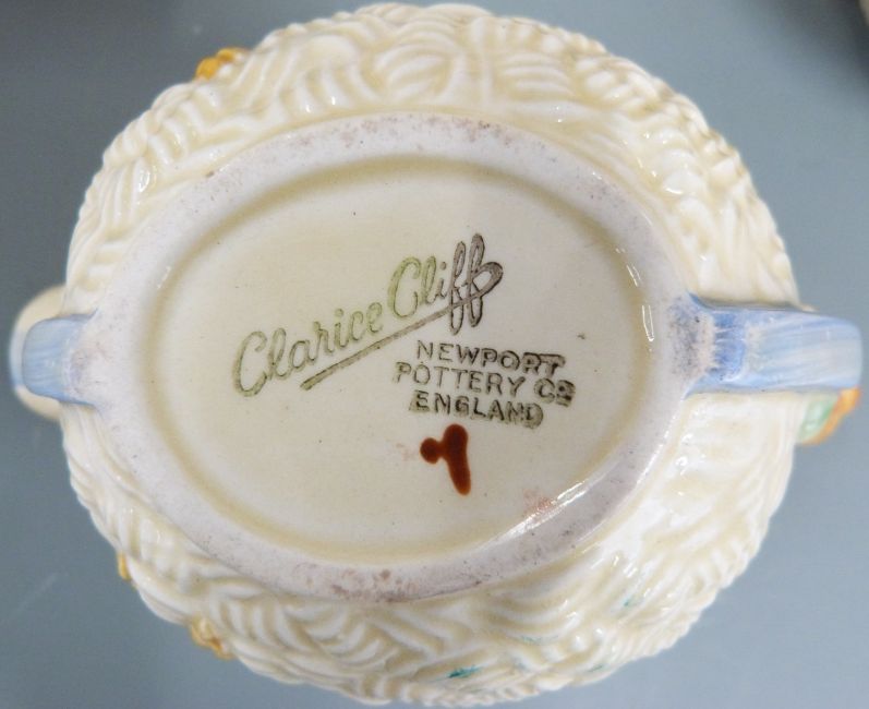 Ten pieces of Clarice Cliff Celtic Harvest pottery including tea pot, basket, biscuit barrel etc, tallest 23cm