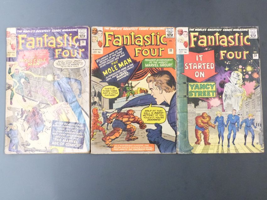 Three Marvel comics Fantastic Four comprising #20 The Molecule Man, #22 The Mole Man and #29 It Started On Yancy Street, 1961.