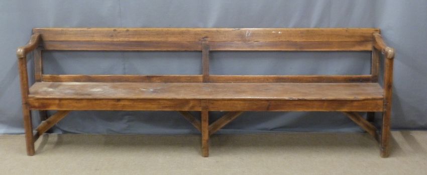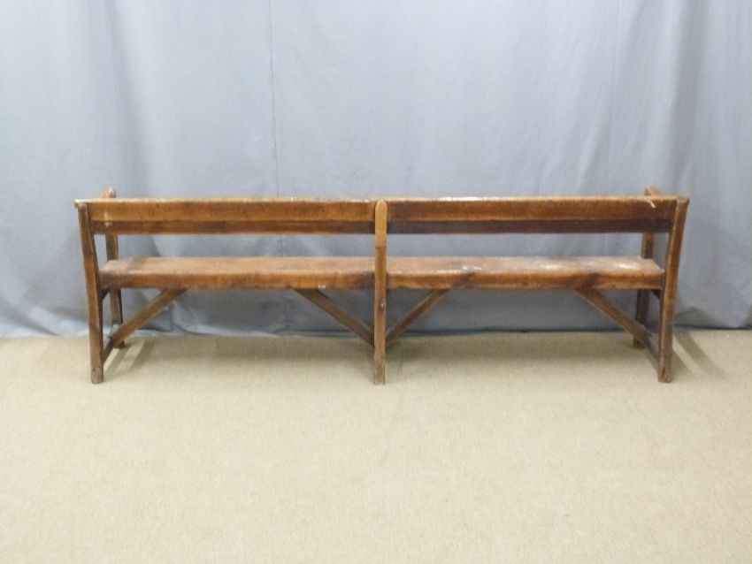 A 19thC pine pew raised on six legs united front to back by simple wooden strainers, ex Cinderford Chapel, Forest of Dean, W230 x D45 x H75cm