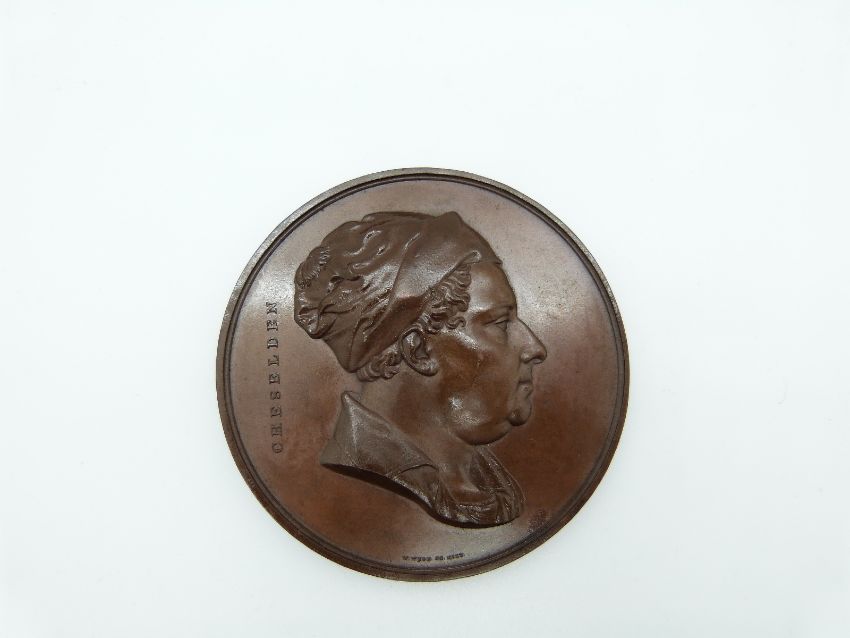 Victorian bronze presentation Cheselden medal awarded to 4th year students in practical surgery at St Thomas's Hospital, London. The medal was founded by George Vaughan in 1829 and is named after William Cheselden, the famous 18thC surgeon and lithotomist at St Thomas's who was influential in establishing surgery as a scientific medical profession. The medal was designed by William Wyon, RA, and depicts the bust of Cheselden, and verso a cadaver with skull, bones and medicine with Latin inscription 'mors vivis salvs, D78mm