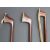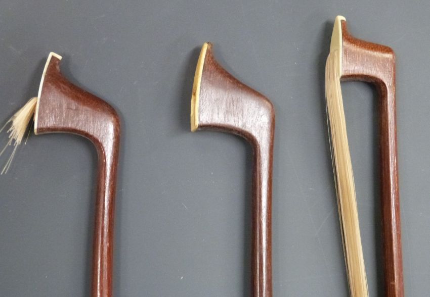 Three viola bows, one having a plain frog, 72.9g, another with Parisian frog eye, 70g, the third with plain mother of pearl eye to frog, 67g