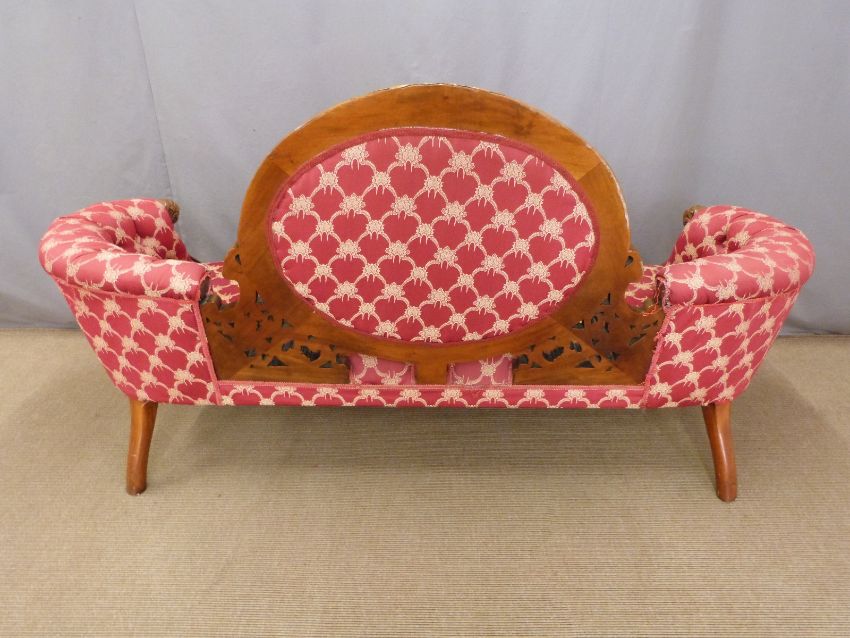 Victorian style mahogany framed upholstered sofa with decorative button back, L196cm
