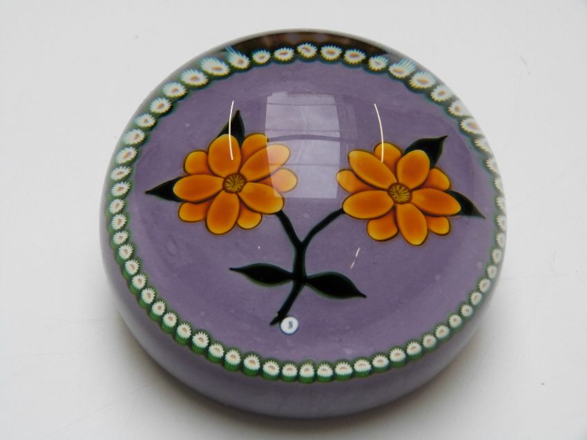 A William Manson 'weight in a crate' paperweight with lampwork flower on mauve ground with signature cane, 6.5cm diam