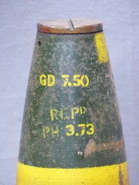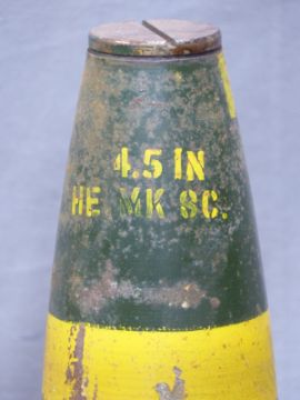 Three British Royal Navy 4.5 inch Mk8 gun practice round, marked to fuses No11 Mk2N, bodies marked Inert Instruct, length 49.5cm