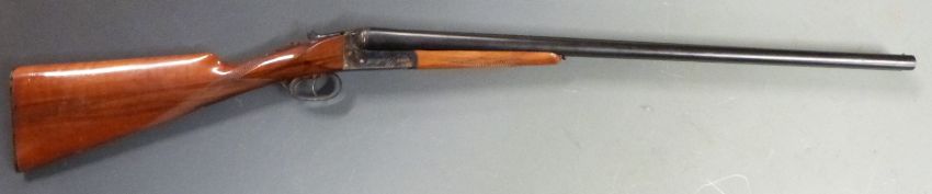 Essex 12 bore side by side shotgun with engraved locks, trigger guard, underside and top plate, gold inlaid thumb lever, chequered grip and forend, double trigger and 27.75 inch barrels choked ½ and ¾, overall length 114cm length of pull 37cm, serial number YZ121947. PLEASE NOTE THAT A VALID RELEVANT FIREARMS/SHOTGUN CERTIFICATE IS REQUIRED TO HANDLE/PURCHASE THIS ITEM.