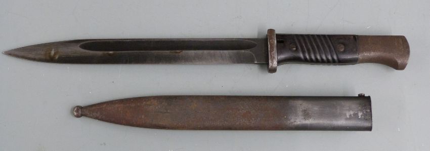 German 84/98 pattern bayonet with flashguard and grooved grips, 42FFC 6168 to ricasso and scabbard
