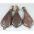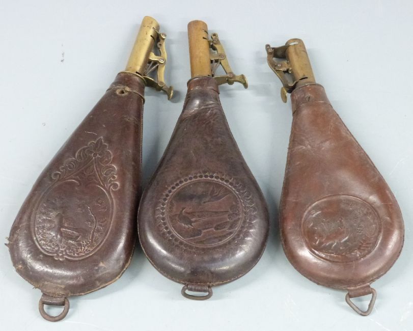 Three leather and brass shot flasks, both with embossed shooting scenes to both sides and belt loops, largest 23.5cm long.