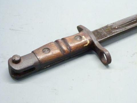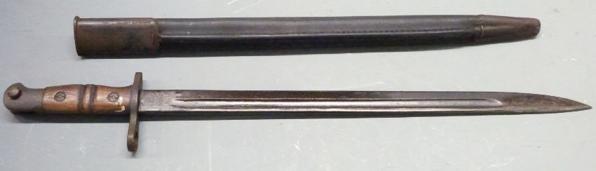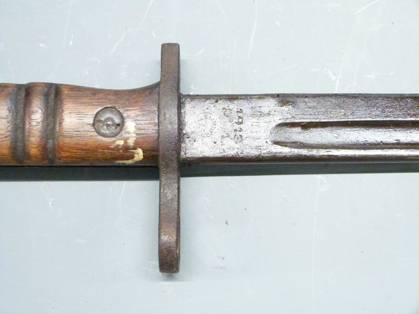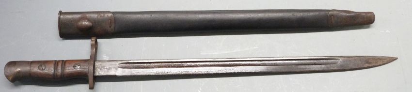 British 1913 pattern sword bayonet, with some clear stamps to ricasso, 43cm fullered blade and scabbard
