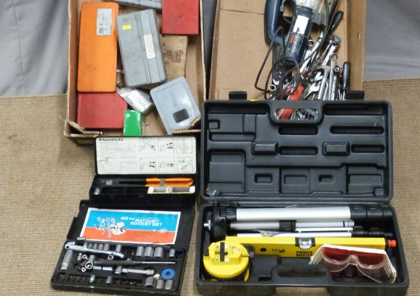 Cased laser level, Bosch jigsaw, assorted tools including socket sets, drill bits etc (two boxes)