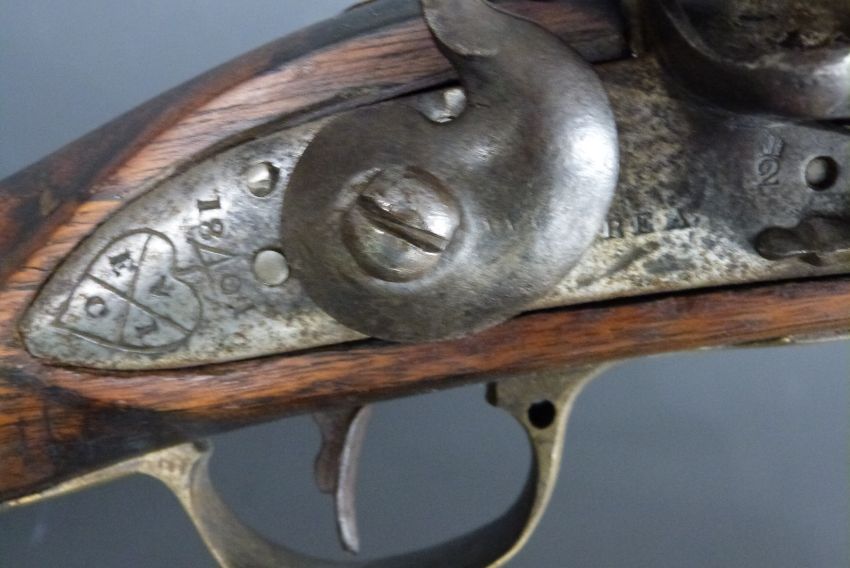 Rea of London for East India Company 1801 flintlock hammer action Brown Bess gun with named, monogrammed and dated lock, brass trigger guard, butt plate and mounts, steel ram-rod, related triangular socket bayonet and 26 inch smooth bored barrel, overall length (excluding bayonet) 107cm.