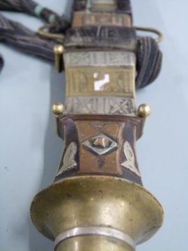 A 19thC African tribal Tuareg or Berber short sword or dagger with white metal and brass hilt in similarly decorated scabbard, L51cm