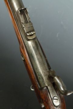 16 bore percussion hammer action with lock stamped with crown over 'VR' cypher and '1864 Tower', engraved hammer, brass trigger guard, butt plate and mounts, steel ram-rod, pop-up ladder sights, sling suspension loops and 39 inch smooth bored barrel, overall length 140cm.