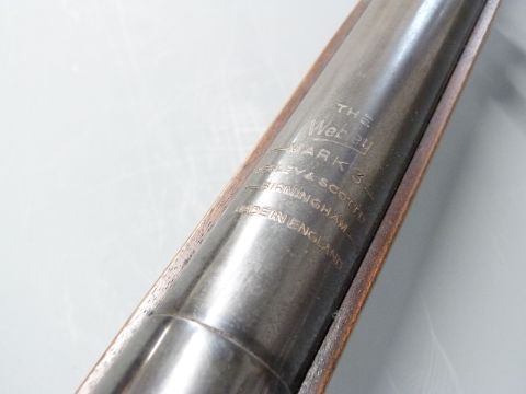 Webley Mark 3 .22 air rifle with semi-pistol grip, inlaid plaque to the stock and adjustable sights, serial number 14235.