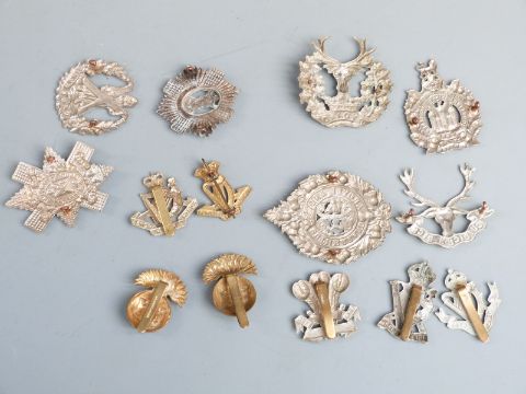 A small collection of regimental cap badges for Scottish and Irish regiments including Black Watch, Cameron, Argyll & Sutherland Highlanders, Royal Irish Regiment and Connaught Rangers