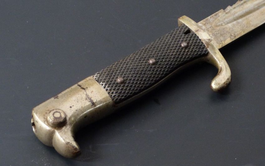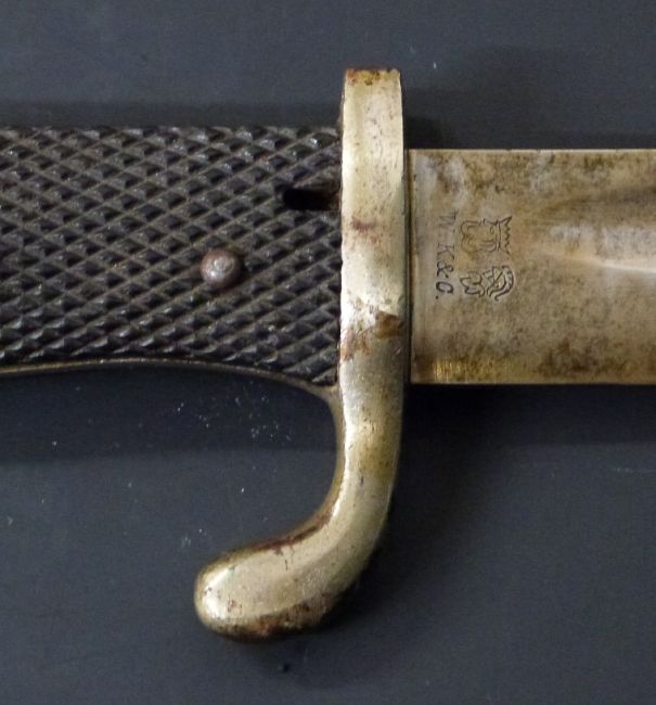 German KS98 pattern sawback bayonet with WK&G maker's mark to ricasso, 25cm sawback fullered blade, scabbard and frog