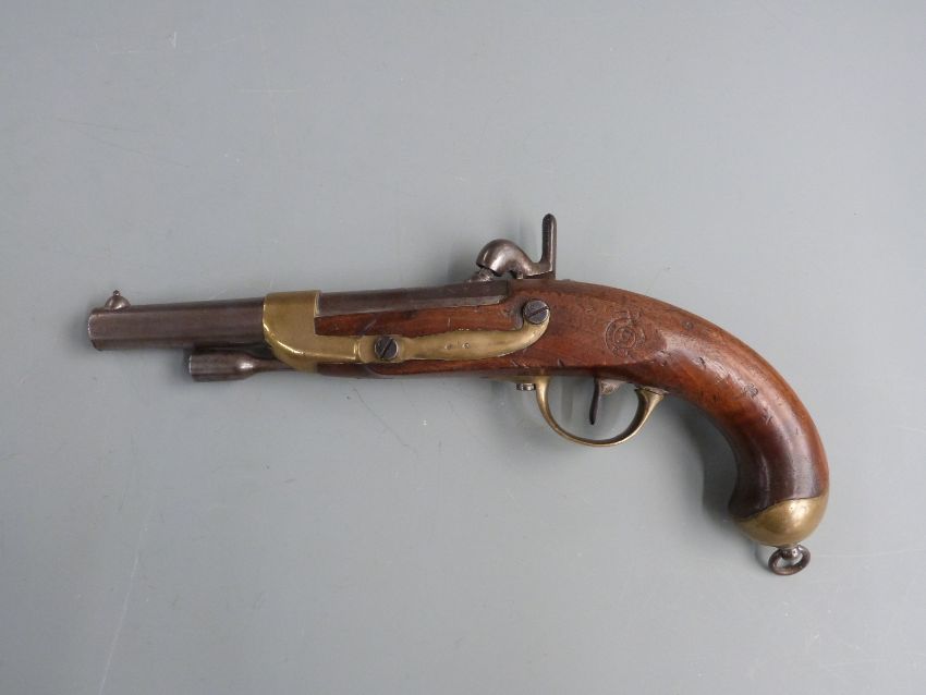 French percussion hammer action Dragoon type pistol with 'Mre Imp de Chatellerault' stamped to the lock, brass trigger guard, butt plate and mounts, steel ram-rod, suspension loop and 7.75 inch barrel stamped 'G 1862 C DE 17-7 N', overall length 36.5cm.