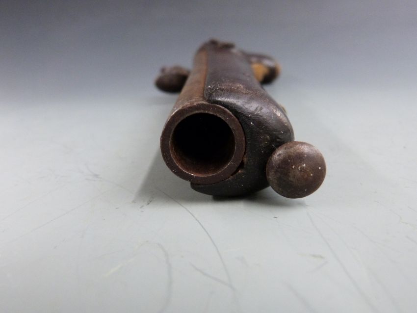 Flintlock hammer action pistol with crown and 'Warranted' stamped to the lock, brass trigger guard, butt cap and mounts, steel ram-rod and 12 inch smooth bored barrel, overall length 48cm.