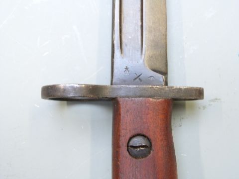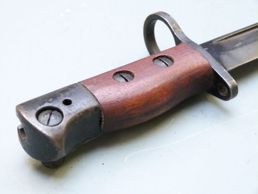 British No5 pattern knife bayonet stamped WS to ricasso, with large muzzle ring, 20cm 'bowie' style blade and scabbard