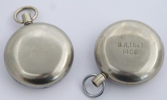 Two British Railways Scottish region Record keyless winding open faced pocket watches, both with subsidiary seconds dial, black Roman numerals and white enamel dial, the case backs marked 'B R (Sc) 1535' and 'B R (Sc) 1408', largest case diameter 58mm
