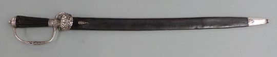 German hunting sword circa 1770 with clam shell guard and 52cm single edged fulllered blade, with silver mounted leather scabbard