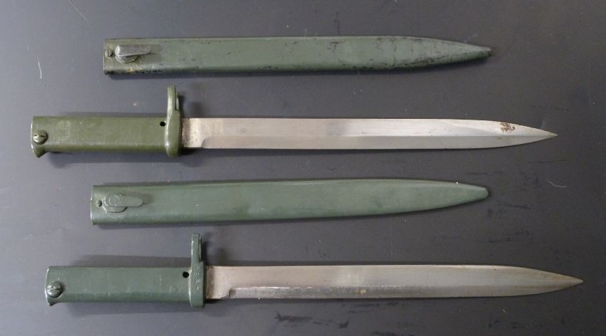 Two German Ersatz all steel bayonets, one stamped 4324 to crosspiece, blade lengths 31cm and 30cm, both with scabbards
