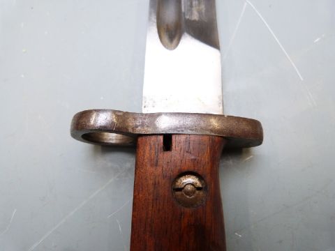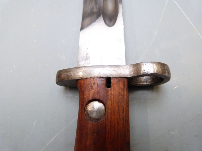 Portuguese 1904 pattern bayonet with wooden grips, 38.5cm fullered blade and scabbard
