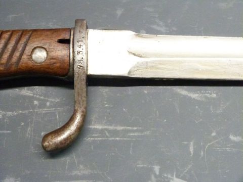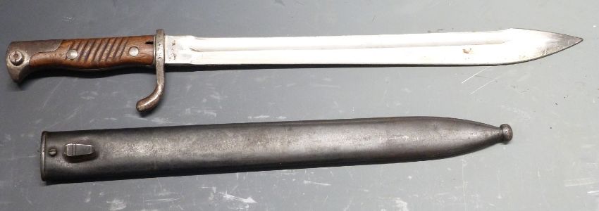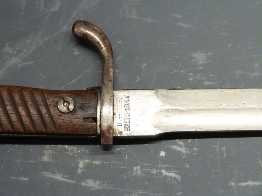 German 1898/05 pattern bayonet with trimmed muzzle ring, stamped to guard Anker-Werke makers, sawback removed 37cm fullered blade ,with scabbard