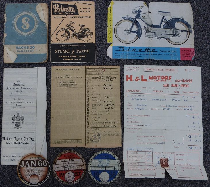 1957 Binetta 49cc 2 speed moped, registration SDG984, with buff logbook, handbook, tax discs and two new tyres