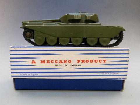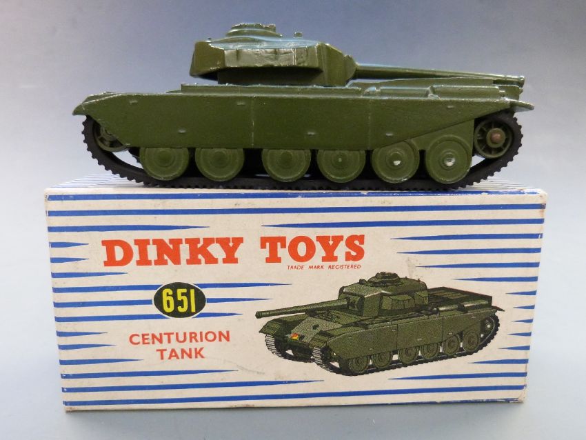Dinky Toys diecast model Centurion Tank with green body and rubber tracks, 651, in original box.