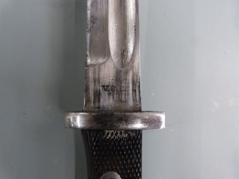 Spanish 1943 pattern dress bayonet, V.C.S makers to ricasso, 25cm fullered blade with scabbard